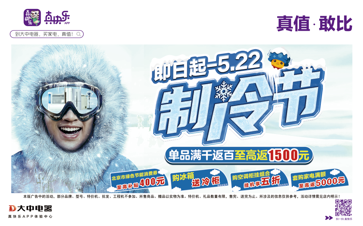 本次制冷节,推出一系列超值让利活动,来满足消费者的不同需求,对有购单品需求的,可以享受单品满千返百,至高返1500元;对于有成套购买家电的消费者,可以享受套购满额至高返5000元。当然对于制冷神器也有相应的活动:购指定型号冰箱送冷柜一台;购指定空调柜挂机组合,挂机可以享5折优惠。 与此同时,真快乐APP和大中电器作为北京市绿色节能消费政策的积极参与者,消费者可以登录真快乐APP进入领券页面领取900元券包,共包含6张消费券,单次至高可补贴400元,到大中电器各门店均可使用,并且可以与其他活动进行叠加使用,实打实的让利消费者。